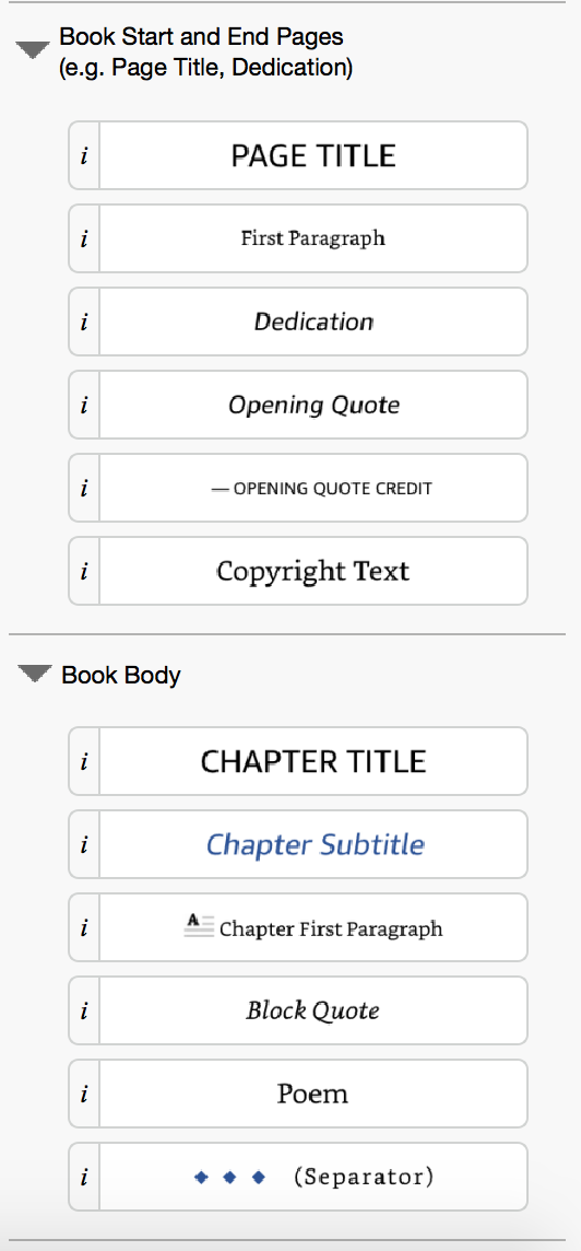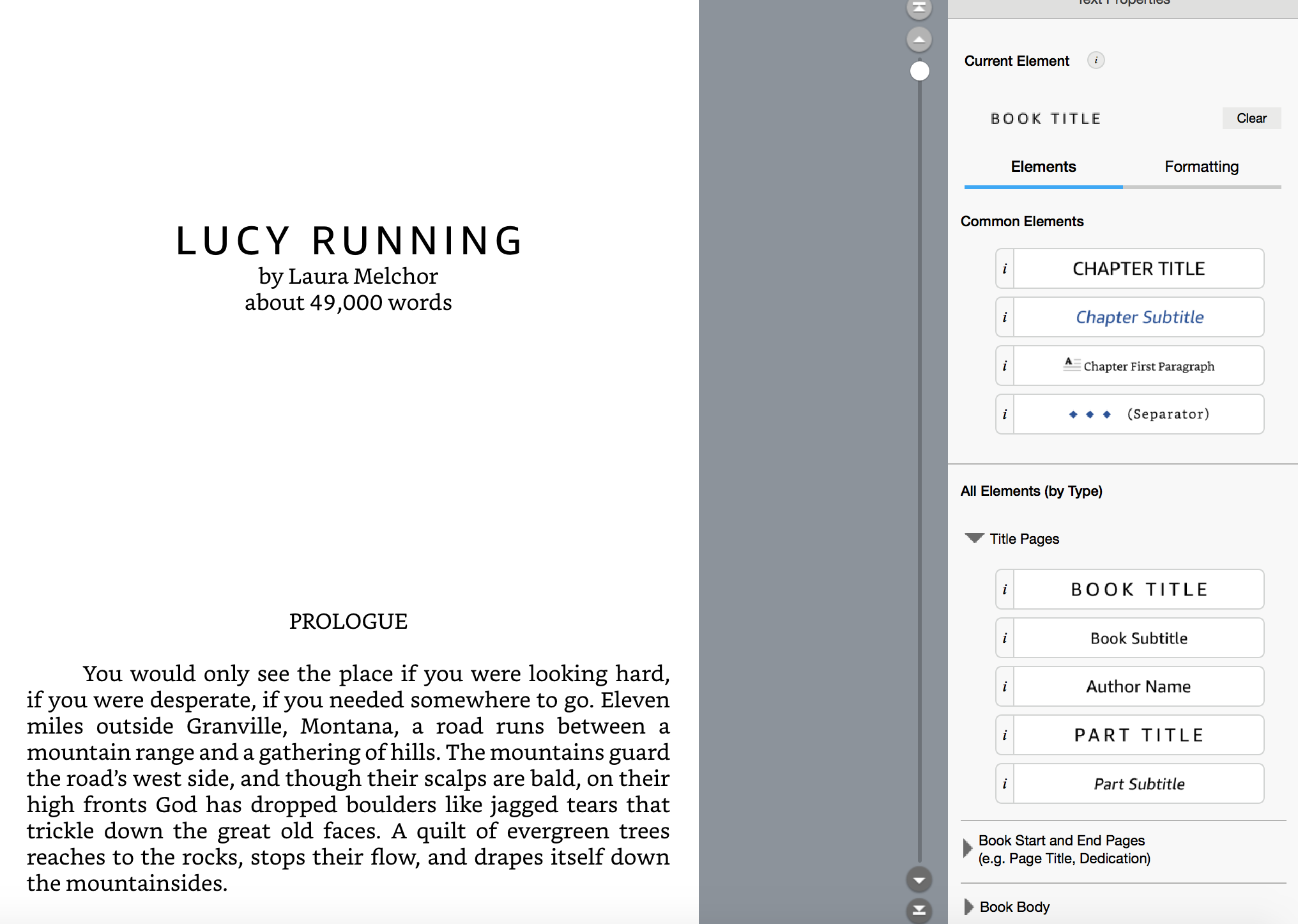 And then you’ll need to click the Book Start and End Pages tab and the Book Body tab to finish formatting all your chapter titles, poems, and other elements.