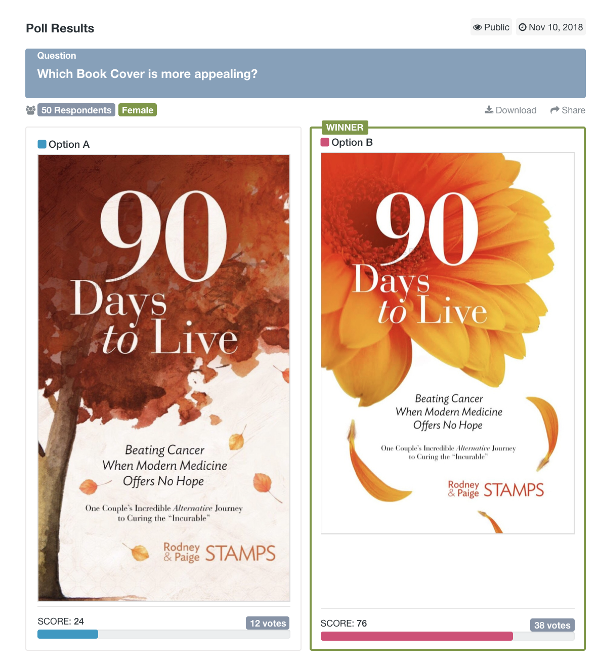 Here’s a better example of a book cover design poll because the design is the only variable. The title, subtitle, and author attribution are the same, so respondents are only reacting to the visual elements.