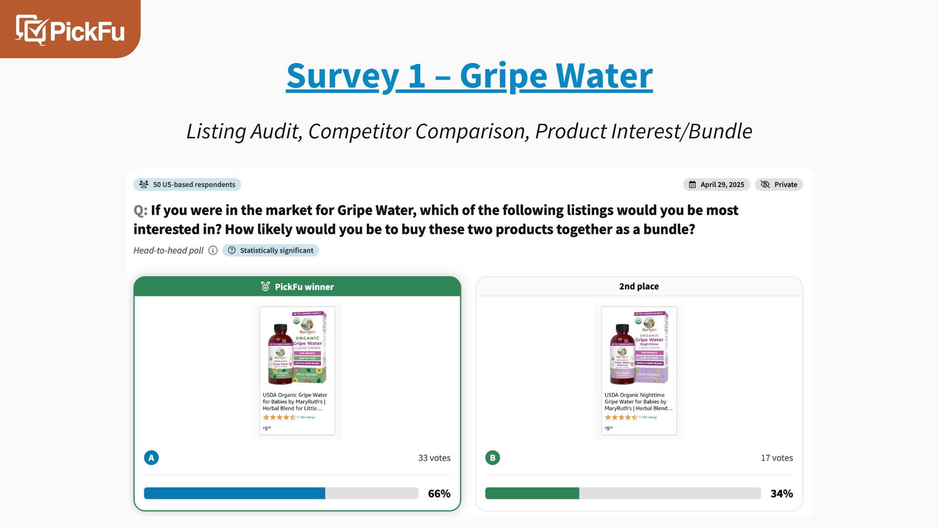 Launching a new product on Amazon can be risky – especially for niche items, such as gripe water for babies. MaryRuth’s used PickFu to evaluate first impressions of two new products: their regular Gripe Water and a Nighttime Gripe Water variant with chamomile.