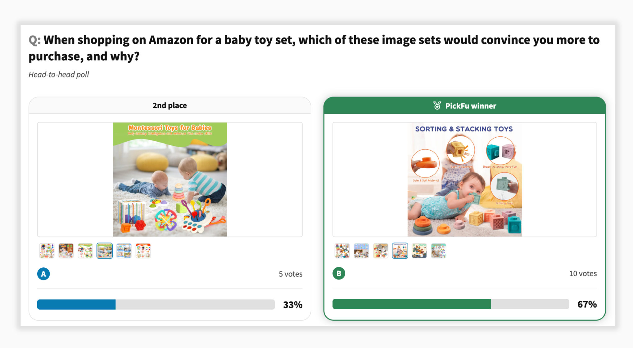 I’ve never had a way to get immediate feedback from real potential buyers like I can with PickFu. It makes a huge difference to our product listings’ rankings and conversions.