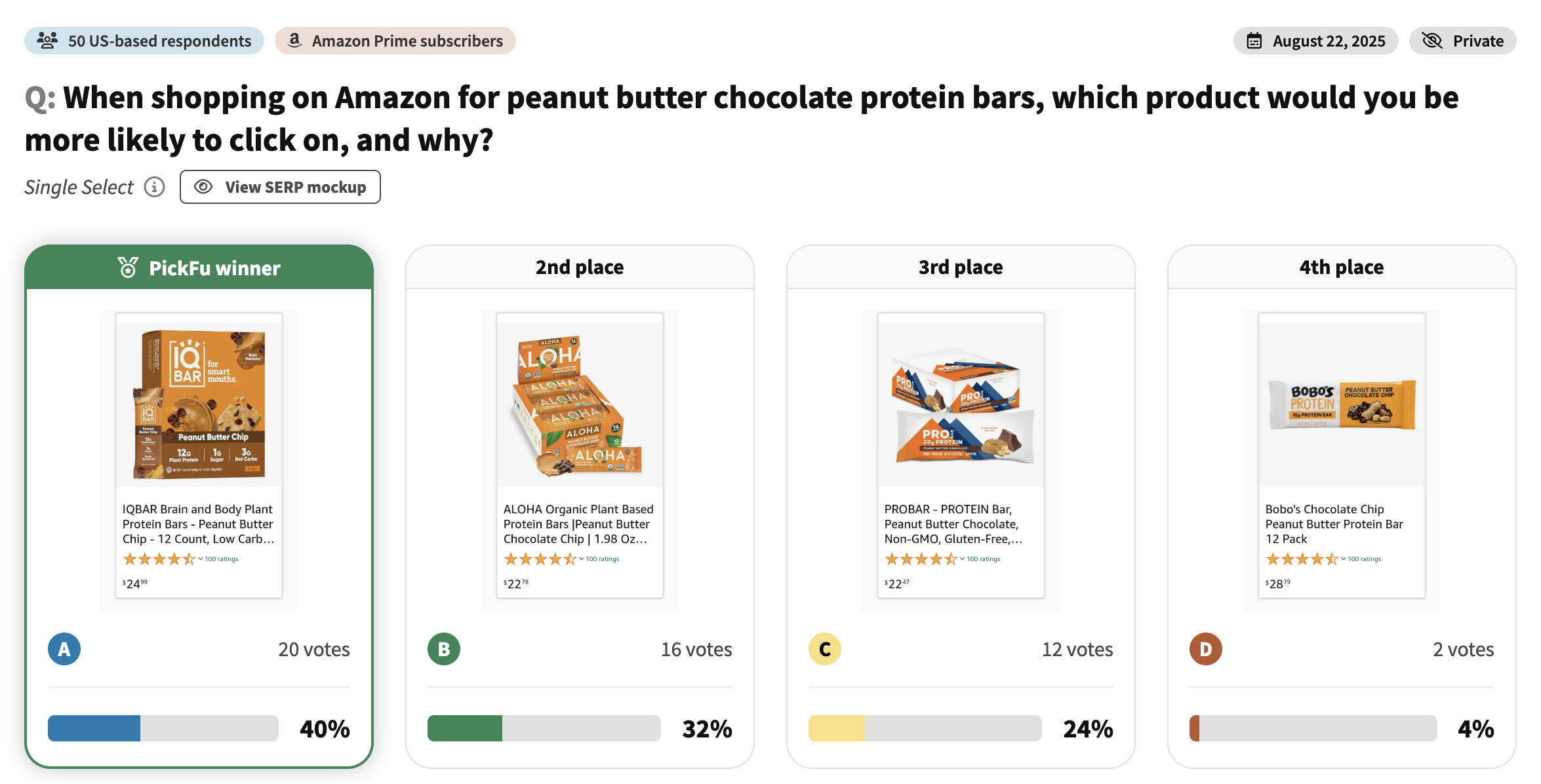 Reduce Amazon product launch risk with consumer validation. Test concepts, prototypes, and variations before investing in inventory. Make confident sourcing decisions based on real Amazon shopper preferences.