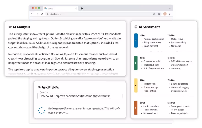 PickFu offers fast, cost-effective, and high-quality consumer insights. Make data-driven business decisions by asking your target audience what they think about your offerings. Optimize your website, product listings, game concepts, book covers, marketing assets, and more with in-depth feedback from real people – starting at just $1 per response.
