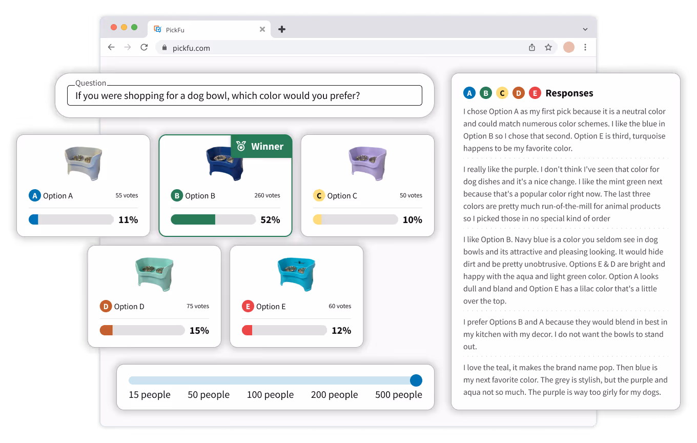 PickFu is for anyone who wants to gather feedback from the people that matter most to their business. Customers across industries like e-commerce, mobile gaming, marketing, and publishing use PickFu to optimize product listings, websites, mobile game trailers, book titles, brand logos, ads, and more – the possibilities are endless.