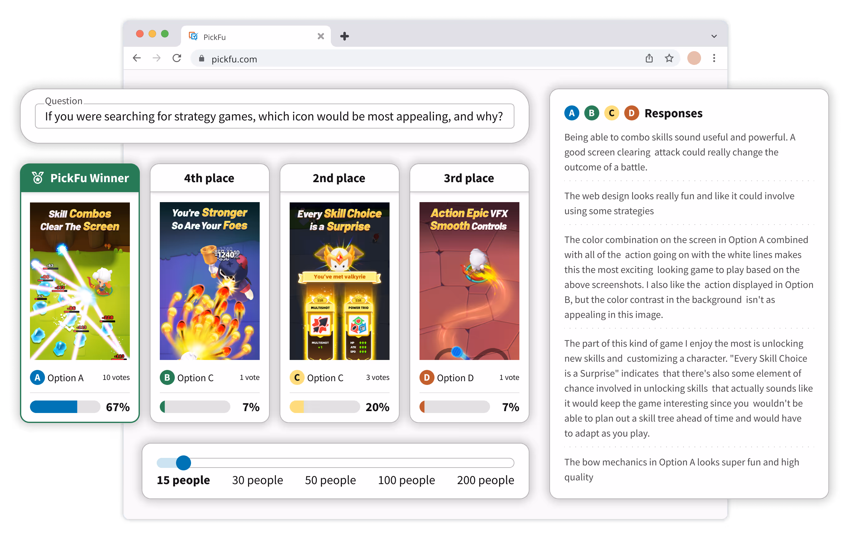 PickFu is for anyone who wants to gather feedback from the people that matter most to their business. Customers across industries like e-commerce, mobile gaming, marketing, and publishing use PickFu to optimize product listings, websites, mobile game trailers, book titles, brand logos, ads, and more – the possibilities are endless.