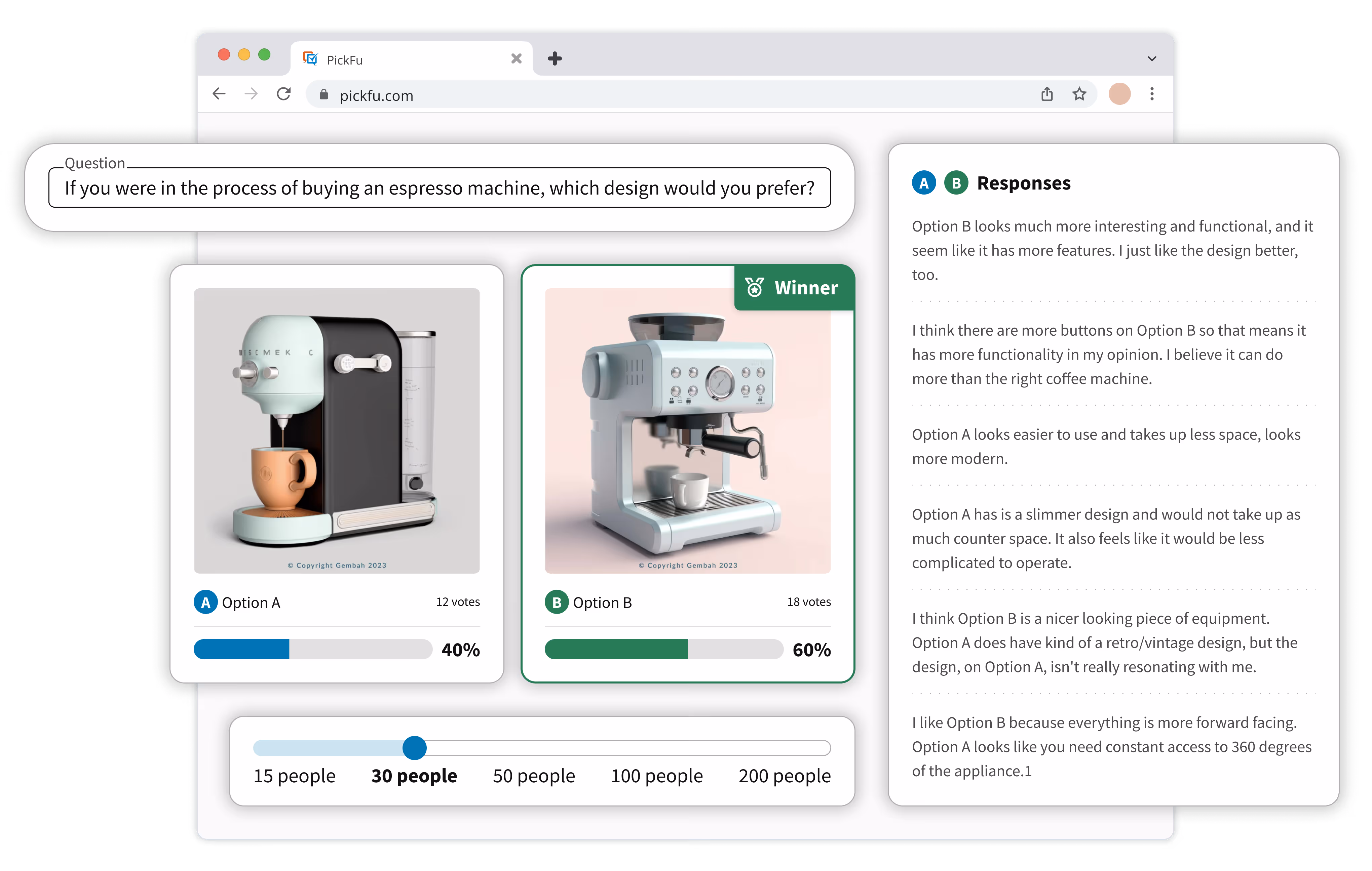 PickFu is for anyone who wants to gather feedback from the people that matter most to their business. Customers across industries like e-commerce, mobile gaming, marketing, and publishing use PickFu to optimize product listings, websites, mobile game trailers, book titles, brand logos, ads, and more – the possibilities are endless.