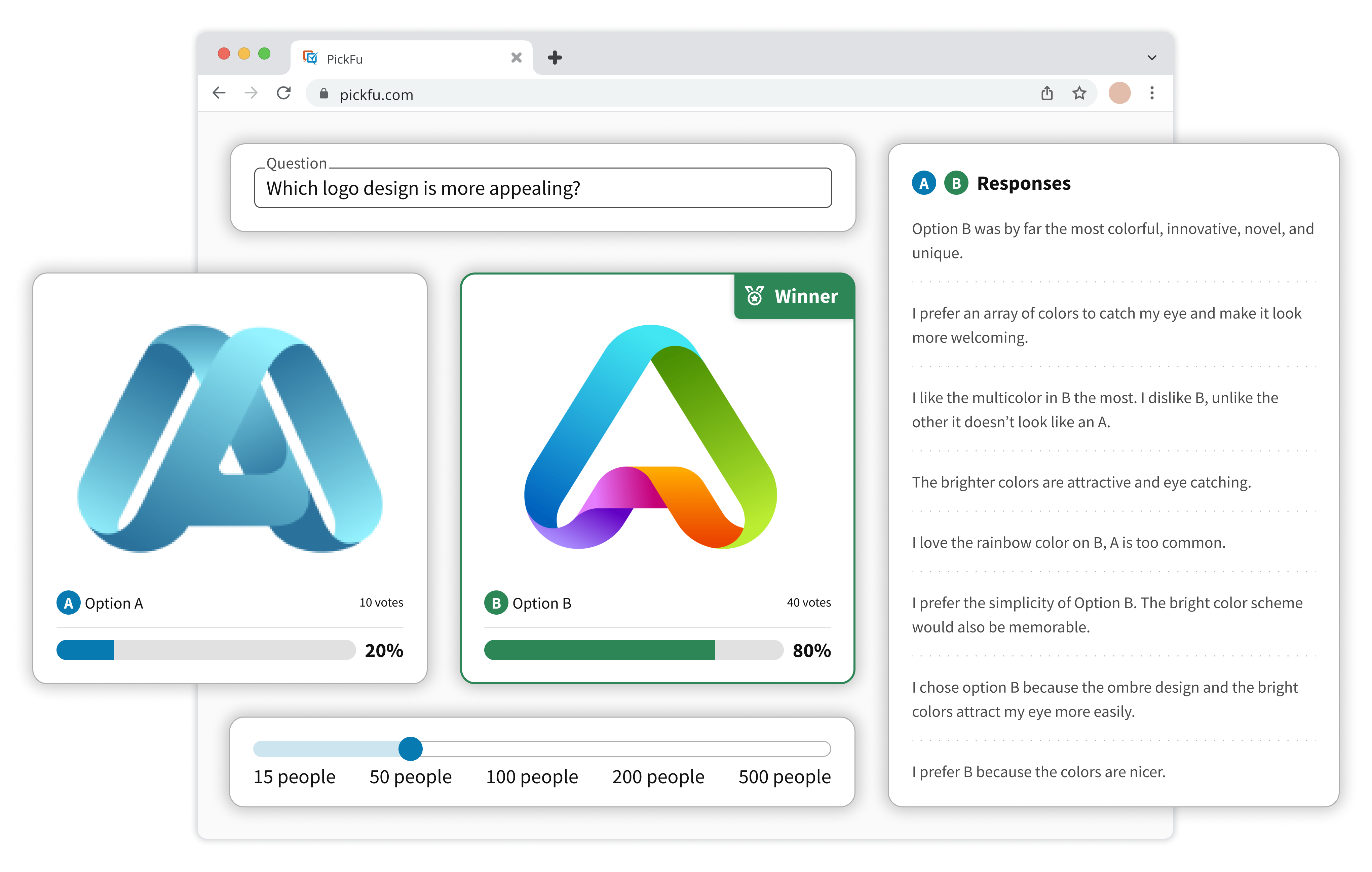 您曾经问过您的粉丝喜欢哪些书籍封面或标题吗?不要再这样做了。人们倾向于模仿他们认为"更知情"的人说的话。相反,请使用 PickFu。从多达 500 个真实用户那里立即获得反馈!